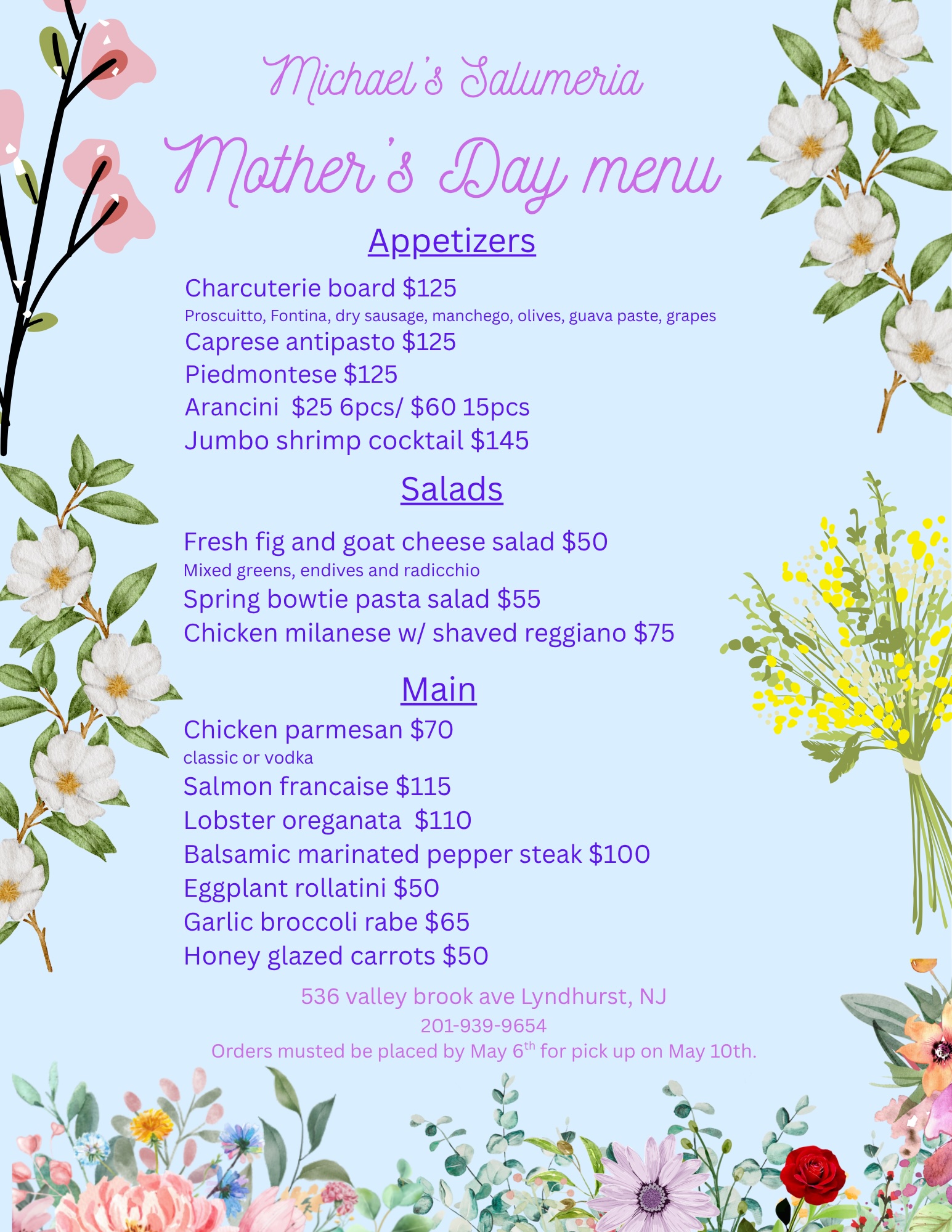 At Michael’s Salumeria you will find a great selection of freshly prepared pastas, eggplants, riceballs, shrimp, and chicken dishes, as well as unbeatable service. Our hand-cut salads, or sandwiches platters on crispy rolls with homemade mozzarella and prosciutto D’ Parma are always a great choice. To take your lunch to the next level try adding some of our flavorful antipasto selection especially our unique sun-dried peppers as well as our hot fried peppers!